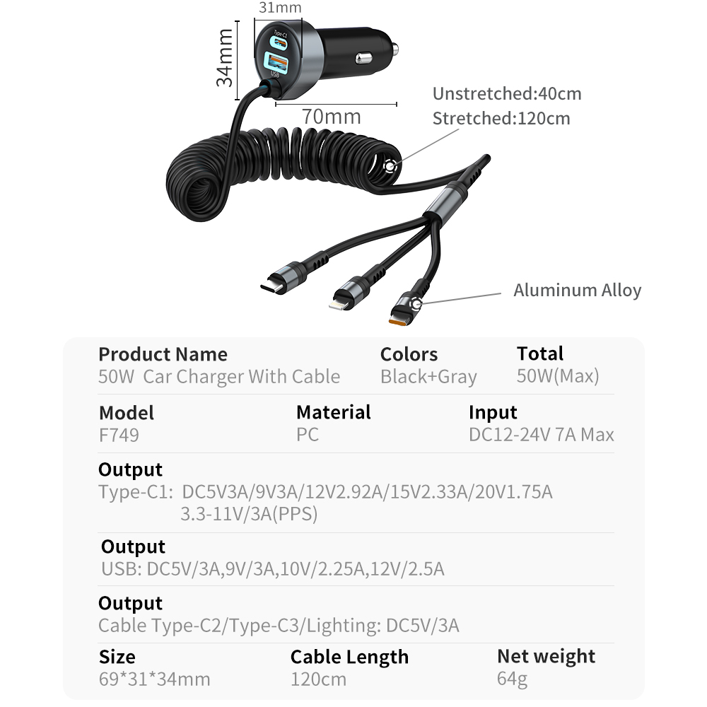 Type-C2/Micro/Lighting:apple2.4 BC1.2 DCP 5V3A 15W